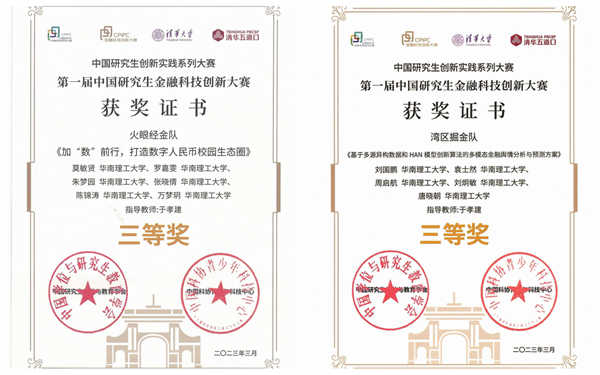 近日,由教育部学位管理与研究生教育司、中国人民银行科技司、全国金融专业学位研究生教育指导委员会指导,中国学位与研究生教育学会、中国科协青少年科技中心主办,清华大学承办的中国研究生创新实践系列大赛成功举办。该赛事在2022年增设中国研究生金融科技创新大赛,华南理工大学经济与金融学院于孝建老师带领的两支参赛队伍,在全国144所高校的453支队伍中脱颖而出,荣获全国三等奖。