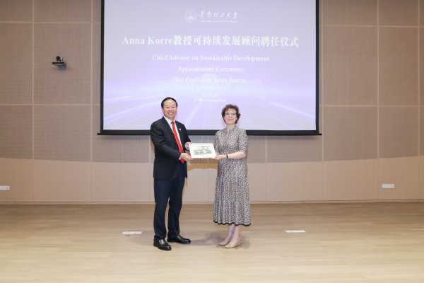 辅导会上,Anna Korre受聘担任华南理工大学可持续发展首席顾问,章熙春为其颁发聘书。Anna Korre详细介绍了帝国理工学院在可持续发展领域的战略与实践,包括将可持续发展理念融入教学、科研及校企合作,并强调了跨学科合作、社区参与的重要性。她指出,中国是帝国理工学院在科学、工程和医学领域最大的研究合作国,华南理工已与帝国理工建立良好的合作基础,未来将推动共同建设可持续发展联盟等合作。