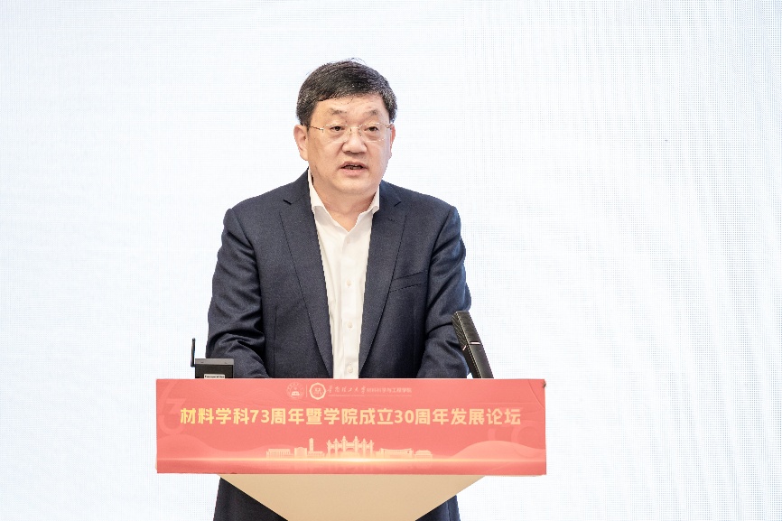 1952年,全国首个橡皮工学、硅酸盐工学专业破土而出;1995年,材料科学与工程学院正式成立;2025年,依托学院建设7个国家级平台、28个省部级平台,学院6系6所(院)格局完善。“自创立以来,材料学科、材料学院始终与学校发展同频共振,与国家需求同向而行。”唐洪武代表学校向全院师生和校友致以诚挚祝贺,并向与会嘉宾表示热烈欢迎。他希望学院以此为契机,加速迈入世界顶尖学科行列;深化教育、科技、人才“三位一体” 融合,激发创新活力;汇聚“万众一心”的力量,再创辉煌,回答好“强国建设、华工何为、材料何为”的时代命题。