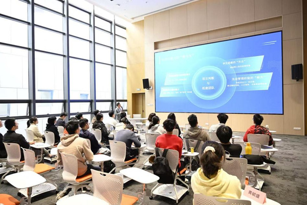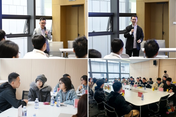 在校友创业经验分享会中,2009级冯世杰、2013级黄毓盛两位校友围绕创业得失选择、资源整合、长期价值沉淀等话题分享见解,并就学业与创业精力分配、大环境下创业决策、出海业务、启动资金获取等具体问题与师弟师妹们进行现场互动。