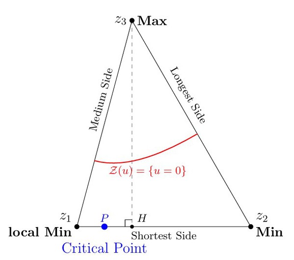 三角形域上的热点猜想:最大最小值的准确位置、临界点个数和位置的示意图
