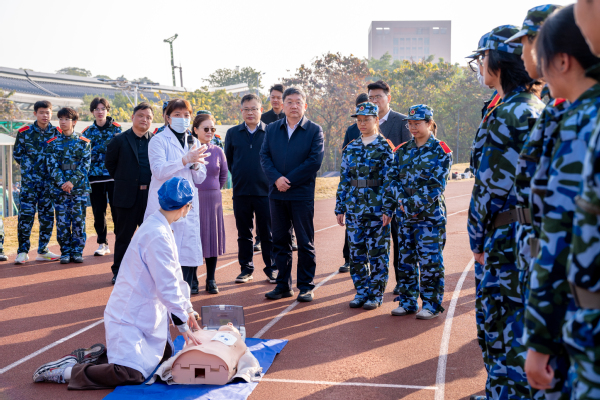 在大学城校区生活区运动场,唐洪武先后观摩了模拟射击、战场救护、军体拳等项目教学,他对同学们的训练成果予以肯定,并与大家交流军训的收获和感受。他勉励同学们脚踏实地、奋勇争先,不仅要练就强健的体魄,更要涵养坚毅的品格,努力成长为堪当民族复兴重任的时代新人。